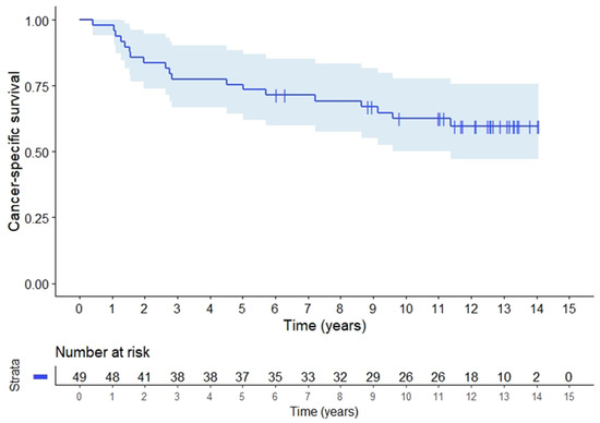The rate of local recurrence alone at 5 and 10 years was 9.1% (95%CI 4.4–13.8) and at 15 years the local recurrence rate was 12.3% (95%CI 0.8–23.8) for all included patients. Distant metastases only occurred in 25.6% (95%CI 12.3–38.9) of the patients after 5 years, 40.4% (95%CI 26.4–54.4) including concurrent local recurrences. For all patients, 5-year RFS was 54.8% (95%CI 40.8–68.8), Figure 2. There was no difference in RFS according to presentation as locally advanced tumours or recurrences. CSS for all patients at 5 years was 73.5% (95%CI 61.2–85.8) and at 10 years 62.5% (95%CI 48.9–76.2), Figure 3. CSS was similar for LARC patients and patients with recurrence. OS was 73.5% (95%CI 61.2–85.8) at 5 years, and dropped to 55.1% (95%CI 41.3–68.9) after 10 years (Figure A1).