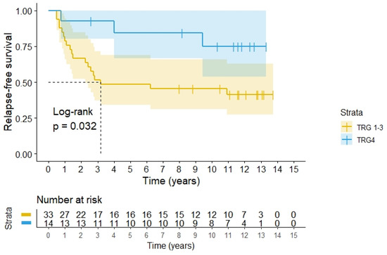RFS according to histopathology classification according to Dworak’s TRG grades for 47 patients operated for rectal adenocarcinomas after preoperative radiochemotherapy with hyperthermia. TRG4 means pCR.