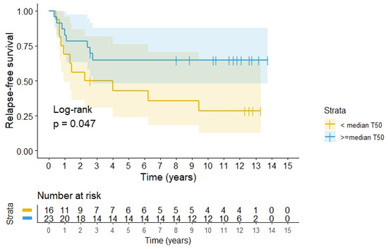 When evaluating outcome in relation to the thermometry data, we were only able to retrieve the original disk recordings for 39 patients, thus data were unavailable for 10 patients. It was found that the RFS was significantly better, 66.7% (95%CI 40.6–86.7) for patients with recordings above 39.9 °C (T50, median of all recordings) versus 31.3% (95%CI 9.3–53.3), p = 0.047, in the lower group, see Figure 5.