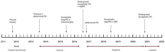 Because of the absence of approved targeted treatment at that time, from October 2011 to February 2012, patient XX was treated with first-line cisplatin 75 mg/m2 + pemetrexed 500 mg/m2 (6 cycles). Best response (BR): stable disease. In July 2013 thoracic and abdominal disease progression occurred (increase of lung parenchymal lesions, carcinomatous lymphangitis, extension in pleural involvement, axillary and abdominal lymphadenopathies). Patient XX was started on ceritinib, taking part in a clinical trial. BR: partial response of disease. In May 2015 the CT scan recorded a new single encephalic lesion at right temporal lobe. Multidisciplinary evaluation: in consideration of the oligoprogressive pattern, the patient underwent exeresis of the right temporal lesion while maintaining ceritinib treatment. Histologic report of brain tissue: lung adenocarcinoma. Biomarker tests: EML4-ALK rearrangement, no evidence of ALK resistant mutations. Treatment with ceritinib, initially well tolerated, was definitively discontinued in April 2016, after progressive dosage reduction, for refractory G3 transaminases elevation. The patient continued with close clinical and radiological monitoring. In July 2016, because of a widespread encephalic progression (new left frontal lobe and left parietal lobe lesions, dimensional increase of previously treated right temporal, left parietal and right parietal lobe metastases) WBRT was performed (30 Gy/10 fr), after multidisciplinary evaluation, with a good radiological and clinical response to treatment. A few months later (October 2016), because of abdominal lymph nodal progression of disease, a new systemic treatment with brigatinib 180 mg/day in the Early Access Program (EAP) was prescribed. BR: partial response (regression of almost all encephalic lesions and partial regression of abdominal lymph nodes). In June 2018, after almost two years from the start of treatment, because of the appearance of a new left frontal–parietal metastasis and the increase of the right temporal one, SRS was performed (18 Gy each). Disease remained stable until October 2020 when a new disseminated encephalic progression occurred. The patient was still in good clinical condition, ECOG PS 1, with only mild cognitive impairment after WBRT. Fourth-line treatment with lorlatinib 100 mg/day in EAP was started.