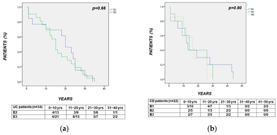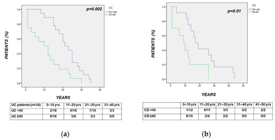 In UC, the Kaplan–Meier analysis showed that the time interval between the diagnosis of UC and the diagnosis of CRC was significantly shorter in patients with UC diagnosed >40 vs. ≤40 years (p = 0.002) (Figure 3a). As for UC, the time interval between the diagnosis of CD and the diagnosis of CRC was shorter in CD patients diagnosed with >40 vs. ≤40 years (p = 0.01) (Figure 3b).