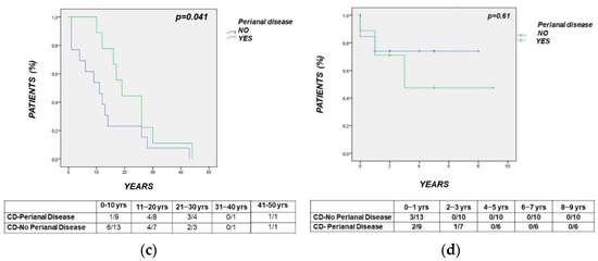 The time interval from the diagnosis of IBD to the diagnosis of CRC was comparable when in patients with left-sided vs. extensive UC (E2 vs. E3: p = 0.66) (Figure 2a) or with different CD behaviors (B1 vs. B2 vs. B3: p = 0.80) (Figure 2b). In CD, the time interval between the diagnosis of CD and the diagnosis of CRC was longer in patients with vs. without perianal (PA) disease (p = 0.04) (Figure 2c). The observed lower median age in CD patients with vs. without perianal disease was at the limit of statistical significance (years: 48 (22–66) vs. 58 (34–76); p = 0.05). The time interval between the diagnosis of CRC and CRC-related death was comparable between CD patients with vs. without PA disease (p = 0.61) (Figure 2d).