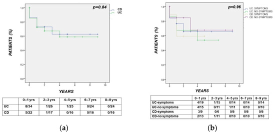 (panels (a,b)) Kaplan–Meier analysis showing that the time interval between the diagnosis of CRC and CRC death did not differ between UC and CD (p = 0.84) (panel (a)) and between IBD patients subgrouped according to a positive vs. negative history of symptoms leading to a diagnosis of CRC (p = 0.96) (panel (b)).