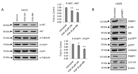 A significant decrease in the phosphorylation of AKT or ILK as well as the mTOR substrate P70S6K were observed after treatment with PJ34 (Figure 2A and Figure S1B,C).