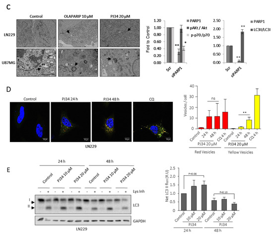 PARP inhibition modulates mTOR pathway and autophagic flux. (A) IB and graphical representation for the indicated proteins in LN229 cells treated with PJ34 at the indicated doses and times. (B) IB and graphical representation for the indicated proteins in LN229 cells transfected with scramble siRNAs or siRNA against PARP-1. (C) Representative electron micrographs depicting autophagosomes (indicated by black arrows) in LN229 and U87MG treated with Olaparib or PJ34 at the indicated doses for 48 h. (D) Representative images and graphical representation depicting autophagosomes (yellow) and autolysosomes (red) in LN229 cells transfected with mGFP-LC3-Cherry plasmid and treated with PJ34 or CQ at the indicated doses and times. At least 250 cells were evaluated in 10 independent fields of view per condition. (E) IB of LC3 in LN229 cells treated with PJ34 at the indicated doses and times, in the presence or absence of lysosomal inhibitors (Lys Inh) for 4 h. Full Western Blot images can be found in Figure S9. Graphical representation of net LC3-II flux, directly proportional to autophagosomes membrane formation and closure, is shown. Data are representative of at least 3 independent experiments. Values are mean ± SEM. ns.: non statistic, * p < 0.05, ** p < 0.01. Student’s t test.