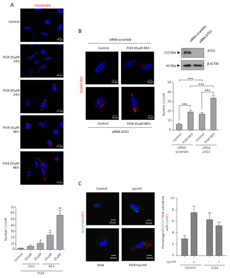PARP inhibition induces Lipid Droplets formation and utilization. (A) Sudan red staining in LN229 cells treated with PJ34 at the indicated doses and times. Lipid droplets quantification using Image J is represented in the right panel. (B) Sudan reds staining in LN229 after ATG1 knock-down followed by PJ34 treatment at the indicated dose and time. Lipid droplets quantitation is shown in middle panel. IB for ACC is shown in right panel. Full Western Blot images can be found in Figure S10. At least 150 cells in 5 fields of view per condition, in 3 independent experiments, were quantified in (A,B). (C) IF and graphical representation depicting Bodipy (green) and LAMP1 (red) Colocalization in LN229 cells treated with PJ34 10 µM (48 h) in the presence or absence of Lys inhibitor for 4 h; at least 250 cells in 10 non-related fields of view per condition and replicate were analyzed and quantified by confocal microscopy. All the data are representative of 3 independent experiments. Values are mean ± SEM. * p < 0.05, ** p < 0.01, *** p < 0.001. Student’s t test.
