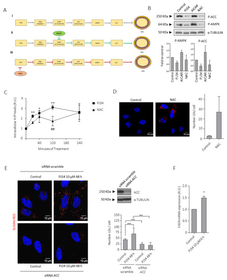 PARPi-induced inhibition of AMPK modulates lipid droplets (LDs) formation. (A) Schematic representation of the proposed mechanism that modulates LDs formation in glioblastoma. The effect of PARP inhibition on PARP, ATP, and AMPK activity (ii) (green arrows) and NAC on ROS accumulation, DNA Damage and PARP activation (iii) (red arrows) is also shown. (B) IB and graphical representation for phospho-ACC (inactive form) and phospho-AMPK (active form) in LN229 cells treated with PJ34 10 µM, AICAR (AMPK activator) 2 mM or NAC (ROS inhibitor) 3 mM for 4 h. (C) Intracellular ATP levels in LN229 cells treated with PJ34 10 µM or NAC 3 mM at the indicated times. (D) Sudan red staining in LN229 cells treated with NAC 3 mM for 48 h. Lipid droplets quantitation is shown in right panel. (E) Sudan red staining in LN229 cells transfected with scramble siRNA or siRNAs against ACC, in the presence or absence of PJ34 for the indicated dose and time. Lipid droplets quantitation is shown in middle panel; at least 150 cells in 5 fields of view per condition, in 3 independent experiments were quantified in (D,E). IB for ACC is shown in right panel. Full Western Blot images can be found in Figure S11. (F) mRNA levels of FASN in the presence/absence of PJ34 at the indicated dose and time. Data are representative of 3 independent experiments. Values are mean ± SEM. * p < 0.05, ** p < 0.01, *** p < 0.001, ## p < 0.01 referred to NAC treatment and ROS accumulation. Student’s t test.