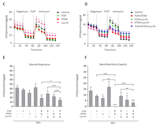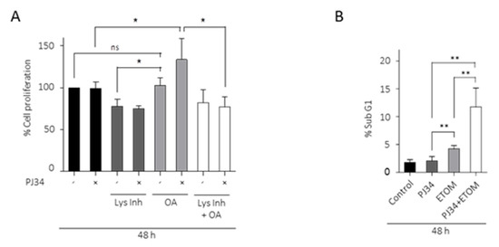 LDs are required as metabolic fuel in glioma cells. (A) Proliferation analysis by MTT assay of glioblastoma cells treated with PJ34 10µM (48 h), OA (12 h) or Lys Inh (4 h). Data from 3 independent experiments were expressed as a percentage of the control. (B) SubG1 fraction was analyzed by flow cytometry after treatment with PJ34 10 µM and/or Etomoxir 100 µM, in absence of serum, during 48 h. Graph shows the mean of 3 independent experiments, 2 replicates by condition. (C,D) Oxygen consumption rates (OCR) in LN229 cells using Seahorse respirometry. Baseline measurements were taken for cells in plain medium, which had been exposed to 10% serum 72 h prior to experiment, treated with PJ34 (48 h) and/or Etomoxir (48 h) and/or Lys Inh for 4 h. Cells were then treated with Oligomycin (1.25 µM), FCCP (2 µM) and antimycin A (1.8 µM). (E) Maximal respiration, calculated by subtracting the non-mitochondrial respiration from the maximum rate measurement after FCCP injection, is shown. (F) Spare respiratory capacity, calculated by subtracting basal respiration from maximal respiration, is shown. Values are mean ± SEM of 5 replicates in one run. Values are mean ± SEM. ns: non statistic, * p < 0.05, ** p < 0.01, *** p < 0.001. Student’s t test.