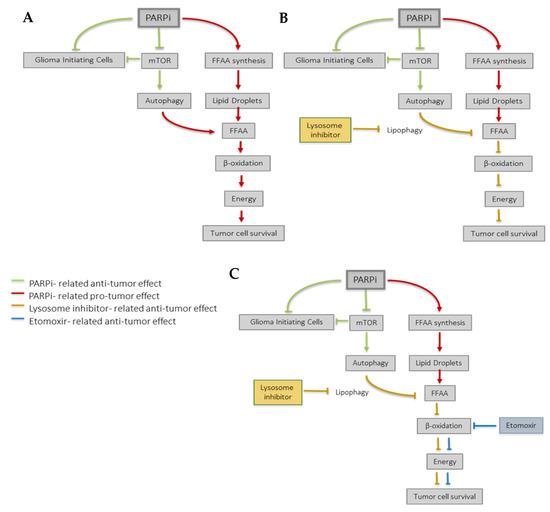 Proposed model for PARPi effect in GBM. (A) PARP inhibition exerts different anti-tumoral effects that compromise the Glioma Initiating Cells’ niche and the AKT/mTOR axis (green lines). However, GBM cells also undergo a metabolic reprogramming in response to PARP inhibition (red lines) which contributes to tumor survival. Briefly, PARPi induces the synthesis of fatty acids (FA) that can be stored in lipid droplets. In case of an energetic demand, autophagy promotes the release of FA from lipid droplets, which undergo β-oxidation and contribute to cell survival. (B) Lysosomal inhibitors (orange lines) may counteract the pro-survival metabolic reprogramming induced by PARP inhibition and (C) this effect may be reinforced by the use of the β-oxidation inhibitor Etomoxir (blue lines), thereby further sensitizing GBM cells to PARPi.