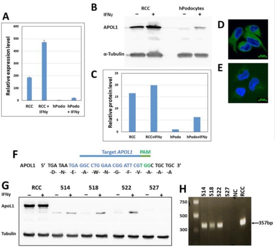 APOL1 expression in RCC 786-O prior and post gene knock-out. (A) APOL1 mRNA levels as determined by RT-qPCR analysis. APOL1 transcription was determined in RCC and normal immortalized podocytes (hPodo), with and without treatment with interferon gamma (IFNγ. mRNA expression values are presented as mean ± SE; (B,C) APOL1 expression at the protein level as determined by Western blot analysis with the anti-APOL1 HPA 018885, with and without treatment with IFNγ; (D,E) Expression of APOL1 in RCC (D) and podocytes (E) was examined using immunofluorescence analysis with anti-APOL1 antibodies (anti APOL1 HPA 018885) (green). Nuclei were stained with DAPI (blue). Bar = 10 µm; (F) Knock-out of APOL1 in RCC cells was performed using CRISPR/Cas9 mediated genome editing, targeting a region in exon 5 of the APOL1 variant B1 (transcript ENST00000319136.8). The guide RNA (gRNA) target (nucleotide 267-302) and PAM sequences TGG are depicted in blue and green, respectively; (G) Analysis of APOL1 expression at the protein level by Western blot analysis of single cell derived clones obtained following gene editing; (H) PCR analysis of genomic DNA of single cell derived clones obtained following gene editing. DNA was amplified using exon 5 specific primers (described in the Section 2). The uncropped Western blots are shown in Figure S3.