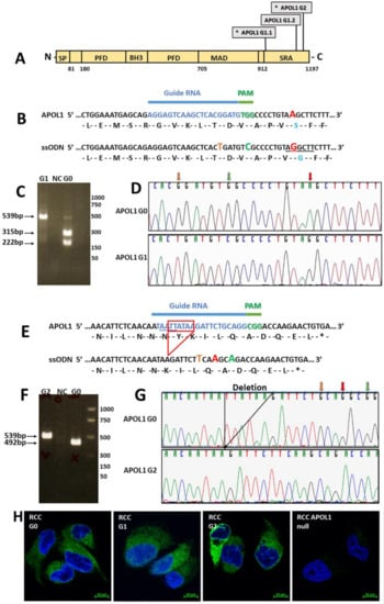 CRISPR/Cas9-mediated generation of APOL1 risk variants. (A) The positions of G1 and G2 polymorphisms in the human APOL1 protein. APOL1 consists of a cleavable N-terminal signal peptide (SP), a pore-forming domain (PFD), a membrane-addressing domain (MAD), and a serum resistance-associated (SRA)-interacting domain. The G1 and G2 renal risk polymorphisms are located near the C-terminus of the protein, at the. SRA-interacting domain; (B) gRNA (blue) and PAM sequence TGG (green) used for knocking in the G1 variant (positioned in exon 7 of APOL1). The single-stranded oligodeoxynucleotides (ssODN) used for homology-directed repair (HDR) appear below the targeted region. The ssODN was designed to alter three nucleotides: an A to G nucleotide change as indicated in red, to insert the G1 variation, and two synonymous changes to prevent re-annealing of the gRNA following HDR: a G to C change in the PAM sequence (green) and a G to T change in the region bound by the gRNA (orange). The A to G change abolishes a HindIII restriction site (underlined). A positive clone of APOL1 G1 knock-in was validated by PCR with specific primers (described in the Materials and Methods section) following digestion with HindIII restriction enzyme (C) and by Sanger sequencing (D). Orange, green, and red vertical arrows in (D) depict the positions of the edited nucleotides; (E) gRNA (blue) and PAM sequence CGG (green) used for knocking in the G2 variant. The single stranded oligodeoxynucleotide (ssODN) used for homology-directed repair (HDR) appear below the targeted region. The ssODN was designed to delete 6 nucleotides (TTATAA), depicted by the red frame, generating the G2 variant. In addition, the ssODN was designed to incorporate three synonymous changes: a G to T (orange) and G to A (red) changes in the target regions of the gRNA, and a G to A change in the PAM sequence, to prevent re-annealing of the gRNA (* = stop codon). The 6-bp deletion abolishes a MlucI restriction site (AATT, underlines in the target region). An APOL1 G2 positive clone was confirmed by PCR specific primers (described in the Materials and Methods section) following digestion with MlucI (F) and by Sanger sequencing (G). Orange, green, and red vertical arrows in (G) depict the positions of the edited nucleotides. (H) Expression of APOL1 G0, G1, and G2 in RCC cells was examined using immunofluorescence analysis with anti-APOL1 antibodies (anti APOL1 5.17D12) (green). Nuclei were stained with DAPI (blue), Bar = 10 µm.