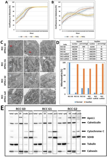 The effect of APOL1 editing on proliferation and mitochondrial shape. APOL1 G0, G1, G2, and null RCC cells were grown in a culture medium containing low concentrations of either glucose or galactose (5 mM each). The proliferation rate was measured using the Incucyte Live-Cell Analysis System at three hour intervals for three days. (A,B) Cell confluency at each time point, indicating the proliferation rate in the presence of glucose or galactose. Values of cell confluency are expressed as mean ± SE; (C) Mitochondrial shape in G0, G1, G2, and null RCC cells were examined using the Talos L120C Transmission Electron Microscope (TEM) (Waltham, MA, USA), at 120 kV (Bar = 500 nm). Red and white arrows indicate clear or swollen mitochondrial cristae, respectively; (D) TEM pictures were screened for mitochondria with swollen cristae appearance versus mitochondria with normal clear cristae appearance; (E) Cellular localization of APOL1 in RCC G0, RCC G1, and RCC G2 cells was examined using differential centrifugation analysis. Protein fractions were collected as follows: Total protein (total), cytoplasmic fraction (cyto), endoplasmic reticulum fraction (ER), crude mitochondrial fraction (crude), and pure mitochondrial fraction (pure). Protein fractions (10 µg) were separated on SDS-PAGE gel, immunoblotted, and subjected to immune-detection using an anti-APOL1 specific antibody. Antibodies used for control: anti-Calreticulin for endoplasmic reticulum (ER), anti-Cytochrom C for the mitochondrial intermembrane space, anti-SDHB for mitochondrial inner membrane, anti-Tubulin for the cytoplasm, anti-Calnexin for the endoplasmic reticulum (ER). The uncropped Western blots are shown in Figure S4.