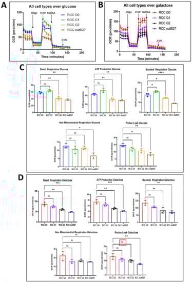 Alteration of mitochondrial morphology can reflect altered mitochondrial function []. As dysfunctional mitochondria have been shown to contribute to tumor progression [], we examined whether the metabolism and the bioenergetics are altered in RCC cells that express the APOL1 RV and manifest the swelling morphology. During tumorigenesis, energy metabolism can be mediated through mitochondrial oxidative phosphorylation (OXPHOS) or via glycolysis, and their levels can be analyzed respectively by measuring the oxygen consumption rate (OCR) and extracellular acidification rate (ECAR). To investigate whether the APOL1 variants affect OCR or ECAR in RCC cells grown on glucose or galactose, we performed real-time measurements of OCR and ECAR during mitochondrial and glycolysis stress tests, using the Seahorse XFe96 extracellular flux analyzer (Figure 4A,B). Basal measurements of OCR values when grown on glucose-supplemented medium indicated higher levels of basal respiration in RCC G0 parental cells and RCC G1 cells (~60–65), compared to RCC null and RCC G2 (~35–40). When grown on a galactose-supplemented medium, RCC G0 and RCC G1 similarly demonstrated higher levels (~70–80) compared with RCC null and RCC G2 (~50–60) (Figure 4C,D). Injection of Oligomycin inhibits ATP synthase, thereby decreasing electron flow through the mitochondrial electron transport chain (ETC) and reducing the values of mitochondrial respiration or OCR, a decrease linked to cellular ATP production. ATP production measurements in glucose-containing media following an injection of Oligomycin yielded values of ~42–50 for RCC G0 and RCC G1, as compared with ~29–30 for RCC null and RCC G2, and ~60–70 and ~40–50 for galactose containing media, respectively (Figure 4C,D). Measurements of the maximal respiration following injection of the uncoupler fluoro-carbonyl cyanide phenylhydrazone (FCCP) disrupt the mitochondrial proton gradient and the mitochondrial membrane potential; hence, the electron flow through the ETC is uninterrupted, and the OCR reaches its maximal rate. This enables calculating the spare respiratory capacity, the difference between the basal and maximal OCR. The results we obtained indicated that the spare respiratory capacity is higher in RCC G0 and RCC G1 compared to RCC null and RCC G2 when grown on glucose (G0, G1: ~80–110, G2 and null: ~40–70), as well as on galactose (G0, G1: ~100–130, G2 and null: ~40–50) (Figure 4C,D). Interestingly, when grown on glucose, RCC G1 cells exhibited somewhat higher OCR values than RCC G0. However, in galactose-containing media, when cells rely heavily on OXPHOS for energy production, a reversal was observed, and RCC G0 OCR values were higher than those of RCC G1, G2, and APOL1 null. This indicates that substrate availability for energy metabolism might play an important role in APOL1 RV function in RCC cells. OCR values dramatically decreased following injection of Oligomycin due to the inhibition of the proton flux through ATP synthase. Hence the change between OCR at basal levels and after oligomycin injection indicates the fraction of oxygen being consumed for ATP production, and with that, the extent of OXPHOS in these cells. In addition, we tested the effect of a combination of rotenone (a complex I inhibitor) and antimycin A (a complex III inhibitor). This combination shuts down mitochondrial respiration and reveals the respiration values stemming from non-mitochondrial metabolism. These assays indicate that regarding APOL1 variants in RCC cells, RCC G0 exhibits the highest values of ATP-coupled respiration. Of note, the Glycolysis Stress test that measures the capacity of glycolysis pathways following glucose starvation did not yield any significant differences between the different RCC cell lines.