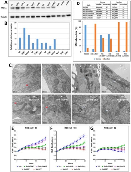 Ectopic expression of APOL1 G0, G1, and G2 in APOL1-null RCC cells. APOL1 G0, G1, and G2 cDNAs were ectopically expressed in APOL1-null RCC null cells. Cells transduced with a pBABE empty vector (EV) were used as control. (A) Western blot analysis of APOL1 protein levels in RCC G0, RCC G1, RCC G2, and RCC null, and from two puromycin resistant single cell derived populations of RCC null cells transduced with each of the APOL1 G0, G1, G2 cDNAs, or with an EV, as indicated. An anti-α-Tubulin antibody was used as a protein loading control; (B) Quantification of protein expression levels in each cell population; (C) Mitochondrial shape of the variously described clones was examined by Transmission Electron Microscope (TEM) (Waltham, MA, USA), and red and white arrows indicate clear or swollen mitochondrial cristae, respectively (Bar = 500 nm); (D) Mitochondria with normal and swollen cristae were counted; the percentage of normal cristae (Normal) and swollen cristae (Swollen) in RCC G0, RCC null, and two single cell-derived populations of RCC null that exogenously express the APOL1 G0 cDNA or an empty plasmid are presented in the upper table and lower graph; (E–G) Proliferation capacity of RCC null cells ectopically expressing APOL1 G0 (E), G1 (F), or G2 (G), as determined by the Incucyte Live-Cell Analysis System (Incucyte zoom 2016B). Two single cell-derived populations of RCC null + G0, RCC null + G1, and RCC null + G2 were grown in a Galactose-containing medium and examined for their proliferation capacity. RCC null cells and RCC null + empty vector (EV) were used for control and are presented in (E–G) as the baseline. Normalized values of cell confluence are expressed as mean ± SE. The uncropped Western blots are shown in Figure S5.