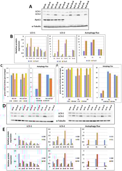 Autophagy flux in APOL1 G0, G1, G2, and null RCC cells. (A) Proteins were extracted from RCC G0 and RCC null cells grown in normal medium (0 h) and under starvation conditions for two and four hours, without or with Bafilomycin A1 inhibitor. The protein levels of LC3-I and LC3-II were determined by Western analysis using the anti-LC3 antibody. Anti-APOL1 antibody was used to confirm the absence of APOL1 expression in RCC null cells, and anti-αTubulin was used as a protein loading control. Protein levels were quantified as described; (B) Autophagy flux was measured by the difference in LC3-2 levels in the presence versus the absence of Bafilomycin A1 inhibitor for each cell sample; (C) Autophagy flux was also evaluated in RCC G0 versus RCC null intact cells using the Tandem Sensor RFP-GFP-LC3B Kit. Cells were grown in normal media (0 h) or under starvation conditions for two hours without or with Bafilomycin A1 inhibitor. Cells were stained using the Tandem Sensor RFP-GFP-LC3B reagent and examined using the confocal LSM 880 upright fluorescent microscope. The red and green dots were quantified using the Imaris Image Analysis Software, and the ratio of green to red dots was monitored. Autophagy flux is calculated as LC3-II levels with inhibitors minus LC3-II levels without inhibitors; (D,E) Western blot analysis and (F) Tandem Sensor RFP-GFP-LC3B methodology were used to monitor the autophagy level in RCC G0 cells compared with RCC G1 and RCC G2, as described above. Autophagy flux was measured in both methodologies by comparing the difference in LC3-2 levels in the presence versus the absence of Bafilomycin A1 inhibitor. The uncropped Western blots are shown in Figure S6.