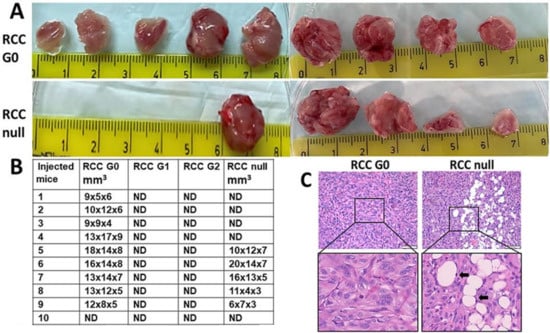 The tumorigenic capacity of APOL1 G0, G1, G2 and null RCC cancer. Cells. Cells were injected intramuscularly (IM) into mice (n = 5). (A,B) Tumors were harvested at 55 days; (C) APOL1 G0 RCC-derived tumors demonstrate a dense tissue typical of a highly aggressive epithelioid tumor. APOL1 null RCC-derived tumors exhibit a less dense tissue with multiple foci of differentiation into adipocytes (arrows). Bar = 100 µm for the upper images and 50 µm for the enlarged images.