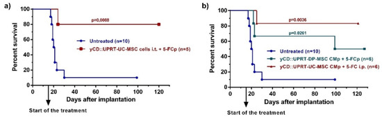Rat glioblastoma C6 growth inhibition mediated by human yCD-UC-MSC-exosomes in vivo. Tumors were induced by 5 × 105 C6 cells inoculated intracerebrally. Animals began treatment with CM from yCD-DP-MSCs and yCD-UC-MSCs applied continuously by an ALZET osmotic pump Model 2ML2 intratumorally with one exchange for a fresh pump. The prodrug (5-FC; 500 mg/kg of body weight) was delivered i.p. three times per week or continuously by an ALZET osmotic pump. Animals were killed on day 100 or 120, and their brains were inspected by histopathology. (a) Survival of rats bearing intracerebral C6 glioblastoma cells treated with 105 yCD::UPRT-UC-MSCs implanted intracerebrally. The prodrug was delivered by an ALZET osmotic pump (b) Survival of rats bearing intracerebral C6 glioblastoma cells treated with yCD::UPRT-DP-MSC-CM and yCD::UPRT-UC-CM applied by an ALZET osmotic pump. Statistical significance was determined by comparison to the untreated animal group. 5-FCp, 5-fluorocytosine delivered by an osmotic pump; CMp— conditioned medium delivered by an osmotic pump.
