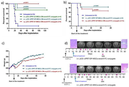 The tumoricidal behavior of yCD::UPRT-UC-MSCs CM-exos/5-FC conjugate and yCD::UPRT-DP-MSCs CM-exos/5-FC conjugate was determined after being applied intranasally, subcutaneously, or intraperitoneally. Intraperitoneal administration of yCD::UPRT-AT-MSCs CM-exos/5-FC conjugate was tested as well. Animals were treated with conjugates applied i.p. and s.c. at a dose of 1 mL three times a week for seven weeks. The intranasal application was performed every day for seven weeks. The treatment was started 15 days after C6 cell implantation. As shown in Figure 4a, 75–100% of rats treated with conjugates from various cellular origins of MSCs (UC, DP, and AT) survived. All modalities of conjugate administration were effective as well. Conjugates also had a rapid onset of action, as shown in Figure 4a, because treatment started only two days before the first rat in the control group died. Based on these results, we chose a higher amount of intracerebral implanted glioblastoma C6 cells in the next experiment. In this experiment, the treatment started 11 days after C6 cell implantation. Rats treated intraperitoneally with yCD::UPRT-UC-MSC-exos/5-FC conjugate had a survival rate of 67%, unlike the intranasally treated group, which had a survival rate of 83% (Figure 4b). Both conjugates did not influence body weight following repeated administration (Figure 4c). The course of treatment was followed by MRI scanning and histopathological examination (Figure 4d).