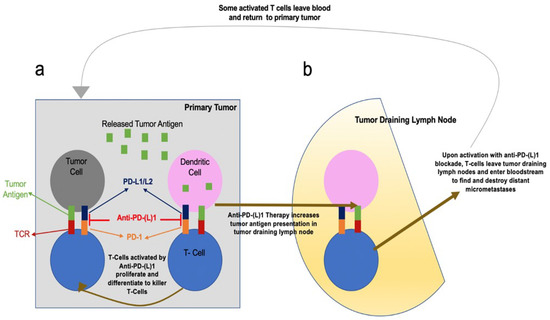 Main theories for enhanced systemic antitumor T-cell activity by neoadjuvant anti-PD-(L)1 Therapy. (a) Anti-PD-(L)1 therapy can stimulate and rejuvenate tumor-specific cytotoxic T cells residing in the tumor microenvironment. Thus, creating an in-situ expansion of tumor-specific T-cells by facilitating their activation, proliferation, and trafficking to micrometastatic deposits. (b) Anti-PD-(L)1 therapy can also improve stimulation of tumor-specific T cells by tumor antigen-presenting dendritic cells within tumor draining lymph nodes. From [18]. Reprinted with permission from AAAS.