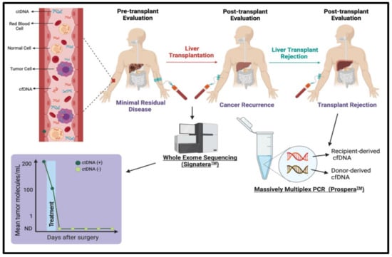 Schematic representation of utilizing cell-free DNA as a biomarker to evaluate minimal residual disease pre-and post-transplant (cancer recurrence), and liver transplant rejection using the Signatera™ and Prospera™Tests, respectively. Figures created with Biorender.com.