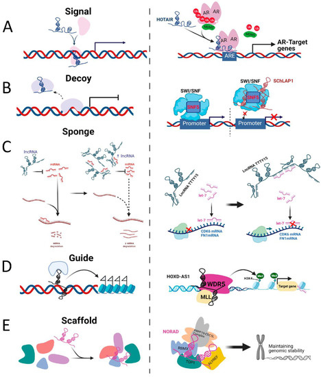 Schematic diagram of the molecular mechanisms of four lncRNA archetypes and their examples. (A) as signals, lncRNAs regulate transcriptional activity or gene expression (e.g., lncRNA HOTAIR). (B) as decoys, lncRNAs can bind transcription factors or regulatory proteins and displace them from DNA binding sites (e.g., lncRNA SChLAP1). (C) as sponges, lncRNAs can function as miRNA sponges and compete for miRNA binding to its target mRNA expression (e.g., lncRNA TTTY15). (D) as guides, lncRNA can recruit or relocalise regulation factors to activate or repress gene expression either in “cis” or “trans”. (e.g., lncRNA HOXD-AS1). (E) as scaffolds, lncRNAs can act as adaptors, bringing binding partner proteins within close proximity to aid the formation of Ribonucleoprotein complexes (e.g., lncRNA NORAD).