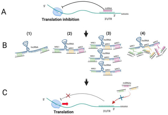 LncRNAs function as competing endogenous RNAs (ceRNAs) to sponge miRNAs. (A) miRNAs bind to the 3′UTR of their target mRNAs to block translation; (B) (1) LncRNAs display complete or partial complementary with miRNAs; (2) LncRNA containing multiple MREs can sequester multiple miRNAs; (3) The increased expression of lncRNAs leads to more binding to miRNAs, resulting in fewer miRNA molecules to bind to other target mRNAs; (4) Different miRNAs bind to lncRNA through same MREs, leading to competition for binding sites. (C) As lncRNAs function as ceRNA to sequester miRNAs away from other target RNA, translation of targets is derepressed.