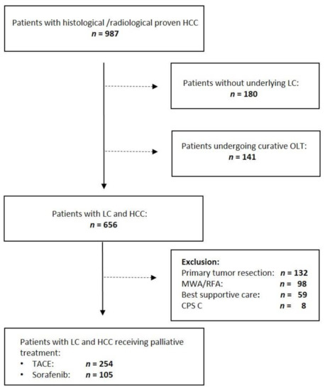 Flow chart of the study. Out of 987 patients analyzed, n = 321 were excluded because they had no underlying liver cirrhosis or had undergone orthotopic liver transplantation (OLT; n = 141). Out of the remaining 656 patients, n = 359 were included in the final analysis. CPS, Child–Pugh score; LC, liver cirrhosis; MWA, microwave ablation; RFA, radiofrequency ablation.