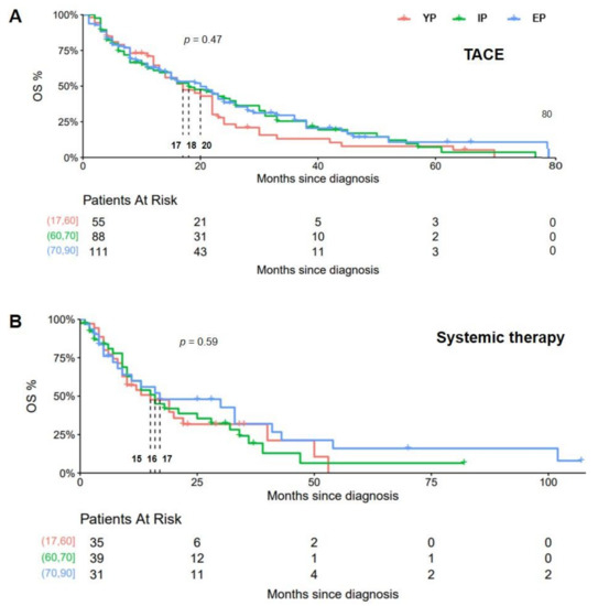 The median overall survival (mOS) differed non-significantly in the cohort of patients receiving TACE (17 vs. 18 vs. 20 months, respectively; p = 0.47) and in patients undergoing systemic therapy (15 vs. 16 vs. 17 months, respectively; p = 0.59). Kaplan–Meier analysis is depicted in Figure 2. Regarding tumor stage, the mOS was without significant difference between YP, IP and EP in patients with an intermediate tumor stage (BCLC B; 15 vs. 16 vs. 18 months, respectively; p = 0.44), but a trend toward prolonged mOS for IP in the cohort of patients with progressed disease was found (BCLC C; 5 vs. 10 vs. 8 months, respectively; p = 0.054).