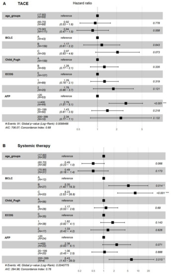 COX regression analysis. Elevated AFP was significantly associated with impaired overall survival in patients undergoing TACE (A). Among the patients who had received systemic therapy, multivariate testing identified advanced tumor stages (BCLC B and C) and elevated AFP as significant risk factors for impaired OS (B). Higher age was not associated with reduced survival, neither in TACE nor in the sorafenib cohort. Significance level: * p < 0.05; *** p < 0.001.
