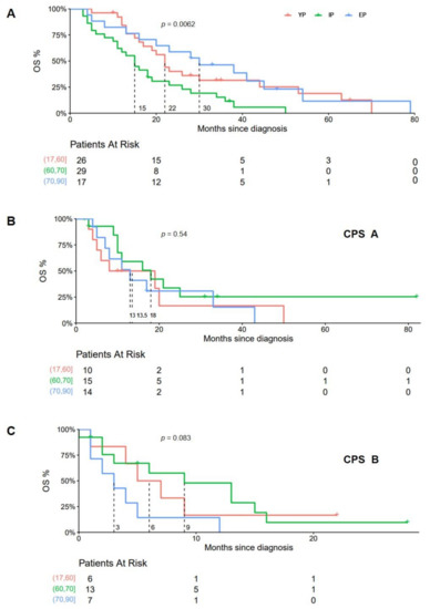 In patients who had received systemic therapy, mOS in CPS A patients was (YP, IP, EP) 13 vs. 18 vs. 13.5 months (p = 0.54) and 6 vs. 9 vs. 3 months, respectively, (p = 0.083) in CPS B (Figure 5). Seventy-two patients had been treated with sorafenib following tumor progression after TACE (sequential treatment). In this cohort, mOS was significantly prolonged in EP (22 vs. 15 vs. 30 months, respectively; p = 0.0062) (Figure 5A).