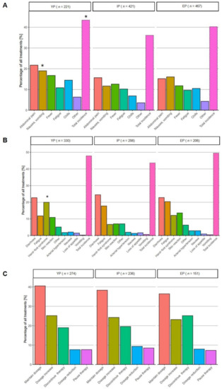Treatment-related adverse events in patients receiving palliative therapy. In patients who had undergone TACE, a total of n = 797 presentations to the outpatient clinic had been analyzed (number of visits (n) are depicted at the top of every column): overall incidence of treatment-related AEs was significantly higher in YP (43% vs. 36% vs. 40%, respectively; p = 0.021), in particular, nausea, vomiting, chills and abdominal pain developed significantly more often in this subgroup (A). While the total incidence of AEs in sorafenib-treated patients differed non-significantly (48% vs. 44% vs. 50%, respectively; p = 0.21), hand–foot syndrome developed significantly more often in YP (17% vs. 5% vs. 14%, respectively; p < 0.005) (B). In the subgroup of patients receiving sorafenib, the rate of dose modification in terms of dose reduction (7.6% vs. 9% vs. 7.9%, respectively; p = 0.23), pausing (7.6% vs. 8.5% vs. 7.3%, respectively; p = 0.21) or discontinuing treatment (19% vs. 19.6% vs. 25%, respectively; p = 0.67) was comparable in all three subgroups, whereas maintenance of dosage was found significantly more often in IP cohort (C). Significance level: * p < 0.05.