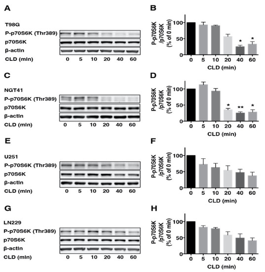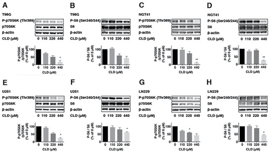 To investigate the effects of the CLD on mTOR signaling, we examined p70S6K phosphorylation via Western blotting using the anti-phospho p70S6K (Thr389) antibody. Results showed that CLD treatment reduced the p70S6K phosphorylation in a dose-dependent (Figure 2A,C,E,G) and time-dependent manner (Figure 3A–H). CLD also inhibited the phosphorylation of ribosomal S6 protein (S6), a substrate of p70S6K, in a dose-dependent manner (Figure 2B,D,F,H), indicating that CLD inhibited the phosphorylation of p70S6K and S6 proteins in a dose-dependent manner.