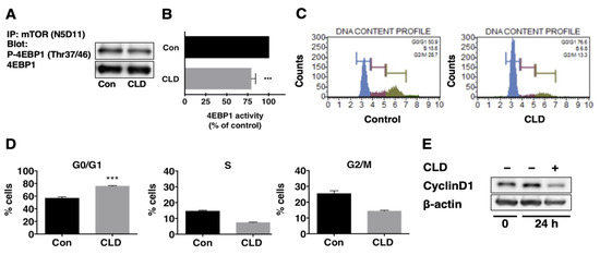 Cells or tumor tissues were lysed and sonicated in lysis buffer (50 mM Tris-HCl, pH 7.5, 150 mM NaCl, 2% sodium dodecyl sulfate (SDS), 10 mM NaF, 2 mM Na3VO4, 5 mM EDTA 1 mM phenylmethylsulfonyl fluoride) and CompleteTM Protease inhibitor cocktail (Roche, Indianapolis, IN, USA). The lysates were centrifuged and the supernatant was collected. The protein concentration in the lysates was determined using the Micro BCA Protein assay kit (Thermo Fisher Scientific, Rockford, MI, USA). Equal amounts of protein (15–30 μg) were subjected to SDS–polyacrylamide gel electrophoresis (PAGE) and transferred to a nitrocellulose membrane. Western blotting was performed using anti-phospho-p70S6K (Thr389) (1:500), anti-phospho-S6 (Ser240/244) (1:1000), anti-S6 (1:4000), anti-phospho-4EBP1 (Thr37/46) (1:1000), and anti-β-actin (1:4000) polyclonal antibodies (Cell Signaling Technologies, Danvers, MA, USA). Anti-p70S6K antibody was purchased from Santa Cruz Biotechnology (Santa Cruz, CA, USA). Membranes were incubated with the indicated primary antibodies at 4 °C overnight. After the membranes were rinsed with TBST (50 mM Tris-HCl pH 7.5 and 150 mM NaCl containing 0.1% Tween 20) and subsequently incubated with horseradish-peroxidase-conjugated secondary antibodies (1:10000; Santa Cruz CA, USA). Immunoreactivity was detected via the chemiluminescence detection method using the ECL system (Bio-Rad, Hercules, CA, USA). The immunoreactive bands were visualized using GeneGnome (Syngene, Cambridge, UK) and quantified using Genetools software (Syngene). The dose dependence of CLD on p70S6K phosphorylation at Thr389 was examined in cultured cells after 72 h of treatment. The levels of phosphorylated and total p70S6K were analyzed via Western blotting and quantified using the Syngene Bio Imaging system (Syngene, Cambridge, UK). The phospho/total p70S6K ratio was determined. β-actin was used as the loading control. For the original Western blots, see the Figure S6.
