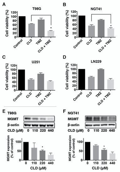 Next, we investigated the effects of CLD and TMZ combination treatment on human glioblastoma cell lines. Each cell line was treated with a vehicle, CLD, TMZ, or CLD in combination with TMZ for 72 h. In our preliminary experiments, we found that the minimum concentration of TMZ that was not totally cytotoxic and could reduce cell viability was 125 μM (Figure S3). Co-treatment with CLD and TMZ significantly increased the cytotoxicity of MGMT-positive cell lines, T98G, and NGT41 (Figure 5A,B). The same additive effect of CLD was not observed in MGMT-negative cell lines, U251 and LN229 (Figure 5C,D). To elucidate the mechanism underlying the effect of combined CLD and TMZ treatment, we examined the MGMT protein level via Western blotting. The results showed that CLD suppressed MGMT in a dose-dependent manner in T98G and NGT41 cell lines (Figure 5E,F). MGMT mRNA expression was not affected by CLD in both cell lines (Figure S4).