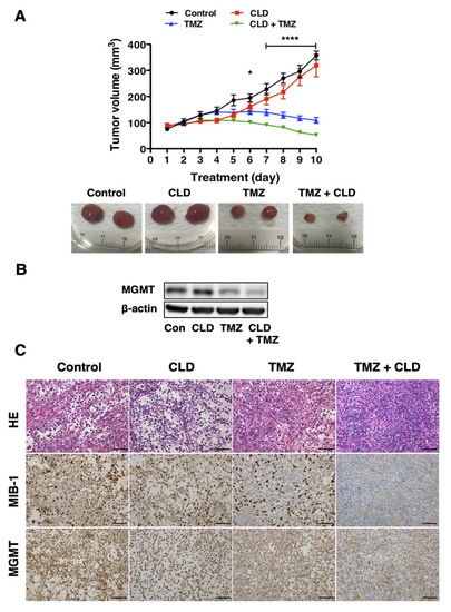 Having confirmed the antitumor activity of the CLD and TMZ combined treatment in NGT41 cells, we next aimed to evaluate the combinatorial effects of these drugs in vivo using an orthotopic xenograft model. Nude mice bearing NGT41 xenografts were administered a vehicle, CLD, TMZ, or CLD in combination with TMZ daily for 10 days. The results showed that the combination treatment with CLD + TMZ significantly suppressed the tumor growth in vivo (Figure 6A). In contrast, CLD monotherapy had no effect on tumor growth in NGT41 xenografts. There were no adverse effects, such as weight loss or gastrointestinal dysfunction in animals that received the combination treatment (Figure S5). At the end of the treatment (day 10), the subcutaneous tumors were resected. Histopathological examination of these tumors showed that the combined treatment markedly decreased the number of MIB1-positive cells (Figure 6C). Moreover, Western blotting showed that the combined treatment suppressed the expression of MGMT in tumors, confirming its therapeutic potential during long-term treatment in vivo (Figure 6B).