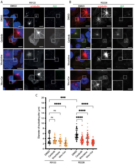 H2228 cells have higher microtubule nucleation capacity than H3122 cells. (A,B). H3122 and H2228 cells were treated with either DMSO, vincristine, ceritinib or in combination for 4 h, then incubated on ice for 30 min to depolymerise microtubules. The cells were released into warm medium for microtubule reconstruction for 5 min before being fixed and stained with anti-ALK (green), anti-α-tubulin (red), and DAPI (blue). Scale bars, 10 μm; magnified views of a selected area are shown. (C). Dot plot shows the diameter of nucleating site per cell from (A,B). Data represent counts from >20 cells, n = 3. *** p < 0.001, **** p < 0.0001 in comparison to DMSO by one-way ANOVA. ns= not significant.