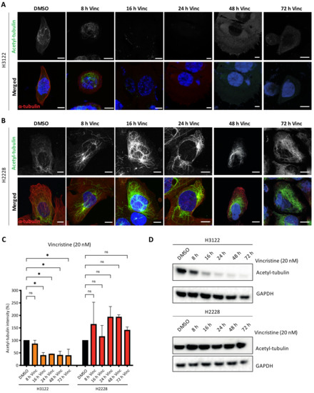 Vincristine treatment reduces tubulin acetylation in H3122, but not in H2228 cells. (A,B). H3122 and H2228 cells were treated with vincristine (20 nM) at the indicated time points before fixated and stained with anti-acetylated tubulin (green), anti-α-tubulin (red) and DAPI (blue). Scale bars, 10 μm. (C). Box plot shows the intensity of acetylated tubulin from (A,B). Data represent counts from >20 cells, n = 2. (D). H3122 and H2228 cells were treated with vincristine at the indicated time points. Western blots of acetylated tubulin are shown. GAPDH was used as a loading control. * p < 0.05, ns = not significant.
