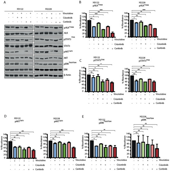 Cells were treated with crizotinib (400 nM), ceritinib (400 nM), vincristine (20 nM) alone or combination for 3 h and then lysed with RIPA Buffer (Cell Signaling Technology) supplemented with phosphatase inhibitors (Santa Cruz). ELISA was performed using the following ELISA Kits according to the manufacturers’ instructions: p-ALK (Y1064) (7324CA, Cell Signaling Technology), p-STAT (Y705) (85-86102, Invitrogen), p-AKT (S473) (KHO0111, Invitrogen) and p-ERK (T202/Y204) (ADI-900-098A, Enzo, Farmingodale, NY, USA).