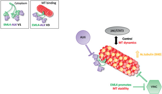 In conclusion, we have shown that combined ALK inhibitor and microtubule destabilising agent treatment inhibits proliferation in EML4-ALK V1 but not V3-harbouring cells. It is known that microtubule network facilitates cellular signalling and EML4 promotes microtubule stability. In EML4-ALK V3, single or combination treatments increase the levels of acetylated tubulin promoting a stable microtubule network and potentially with the aid of the active JAK/STAT3 pathway prevent cell death (Figure 6). The short EML4-ALK V3 cells exhibited stable microtubules, but not V1, suggesting that the part of EML4 protein in each variant could determine the outcome of the treatment. This study suggests a drug resistance mechanism of EML4-ALK V3, which has a significant impact on both ALK-TKI and vincristine response. However, the EML4-ALK V1 cell line was sensitive to those drug treatments. Overall, these results provide new mechanistic understanding to support rational approaches to polytherapy in EML4-ALK positive patients, in which the specific combinations are chosen based on variant type and other molecular markers such as acetylated tubulin. This strategy is one we believe should be taken to improve the outcomes for EML4-ALK positive-NSCLC patients in the future.