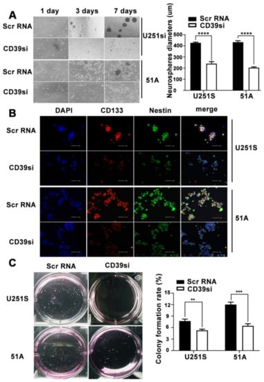 Neurosphere formation, fluorescence on stemness marker, and soft agar colony forming assay were used to clarify whether CD39 regulates the GSCs self-renewal, proliferation and stemness. When CD39 was knockdown in U251S and 51A cells, we confirmed the decrease of forming neurosphere ability by measuring and quantifying the diameter (Figure 3A), and immunofluorescence also indicated downregulation of the stem markers CD133 and Nestin (Figure 3B). Moreover, the expression of CD39 is positively related with the number of GSCs colonies (Figure 3C). In addition, the number of GSCs colonies was also significantly reduced.