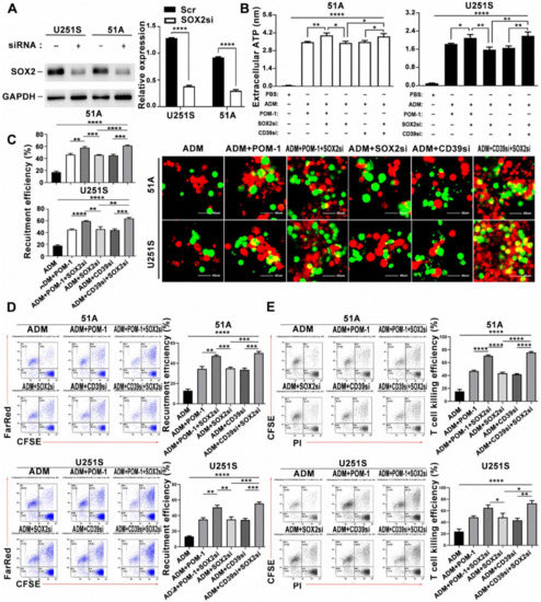 To explore the mechanism of CD39 up-regulation in GSCs, TIMER analysis for immuno-infiltrated cells was performed according to the expression of SOX2 in glioma patients. We found that SOX2 was negatively related with the infiltration of myeloid DCs and plasma DCs (Figure S3C). This is the same as the increasing trend of dendritic cell recruitment efficiency in the patients of CD39 low expression. Thence, we used siRNA to knockdown SOX2 expression, and the knockdown efficiency was detected by western blot (Figure 5A and Figure S4). Then we treated GSCs with CD39 siRNA and SOX2 siRNA, and co-cultured GSCs with DCs. As we expected, the recruitment efficiency of DCs increased in both the CD39si and the SOX2si group (Figure S3D,E). Next, we measured eATP in different groups. Compared with the control group, eATP concentration was increased after SOX2 knockdown, which was basically the same as the CD39 interference group. Moreover, eATP was further increased in combination of ADM, CD39 inhibition and SOX2 knockdown (Figure 5B). GSCs were co-cultured with DCs alone or DCs and T cells together. The phagocytosis of DCs was observed by confocal microscope (Figure 5C) and flow cytometry (Figure 5D). Flow cytometry analyzed the killing efficiency of T cells (Figure 5E). The recruitment and phagocytic ability of DCs and the killing efficiency of T cells were increased when SOX2 was knockdown. These results suggested an enhanced effect of SOX2 knockdown in ATP release and DCs phagocytosis in GSCs.