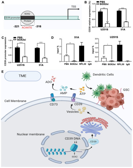 SOX2 bound to the CD39 gene promoter region to regulate eATP concentration and further affected immune cells function. (A) Schematic diagram of the binding sequence of SOX2 protein and CD39 promoter. (B) U251S and 51A GSCs transfected with CD39 promoter luciferase reporter gene and Renilla luciferase internal control were used to detect the binding of SOX2 and CD39 promotor, and luciferase activity was normalized to Renilla activity. (C) QPCR analysis of the expression of CD39 after SOX2 knockdown. (D) ChIP and RT-qPCR analysis for SOX2 protein binding to CD39 gene promoter region. (E) The mechanism diagram describes the process of SOX2 regulating the CD39 promoter. Data in B, C, D are represented as the mean ± s.d., n = 3, * p < 0.05, ** p < 0.01, *** p < 0.001, **** p < 0.0001, student’s t test.