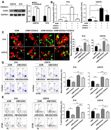 51A and U251S were transfected with pcDNA-CD39 to overexpress CD39 cDNA, and the transfection efficiency was verified by western blot analysis (Figure 7A and Figure S4). As depicted in Figure 7B, SOX2 knockdown increased the eATP concentration, while the CD39 overexpression decreased the eATP concentration. Interestingly, CD39 overexpression reverted the increase of eATP concentration induced by SOX2 knockdown. The recruitment of DCs and the killing efficiency of T cells measured by flow cytometry and confocal microscopy analysis showed consistent results (Figure 7C–E), suggesting that CD39 directly regulates the eATP concentration of GSCs, and SOX2 regulates the eATP concentration through CD39. The high expression of CD39 in GSCs plays an important role in tumor evasion from immune surveillance.