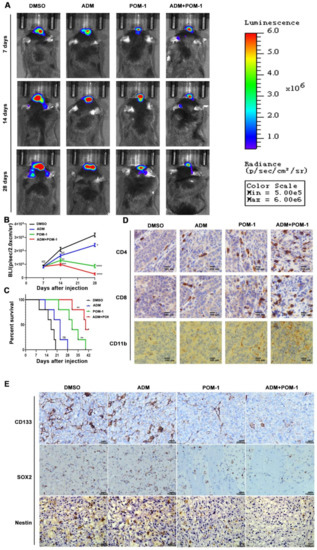To further explore the anti-tumor effect on ADM and CD39 blockade in vivo, C57BL/6J mice were intracranially implanted with GL261s GSCs transfected with luciferase encoding lentivirus. The tumor size at 7, 14, 28 days after cells implantation was evaluated by the in vivo imaging system. The photon measurement for tumor size showed that POM-1 inhibited tumor growth (Figure 8A,B), and the survival time of mice treated with POM-1 was significantly longer than that of control group (Figure 8C). The effects on tumor growth inhibition and survival time extension were more obvious in combination of ADM and POM-1 treatment compared with ADM or POM-1 alone. Immunohistochemistry analysis showed that CD4+, CD8+ T cells and CD11b+ DCs were significantly increased in the tumors in the POM-1 group, especially POM-1 combined with ADM group (Figure 8D). Meanwhile, stem cell components of the tumors were significantly reduced in the POM-1 group, especially POM-1 combined with ADM group (Figure 8E). These data indicated that CD39 inhibition improves anti-tumor immunity in a mouse glioma model.