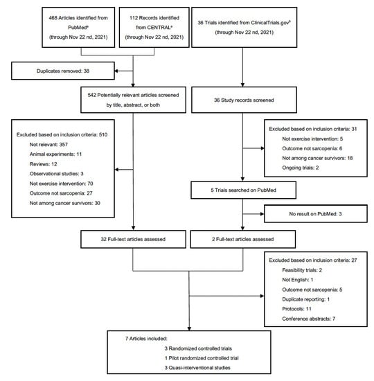 We conducted a systematic search on PubMed, CENTRAL (Cochrane Central Register of Controlled Trials) and ClinicalTrials.gov from inception until November 2021 using keywords related to “exercise”, “physical activity”, “sarcopenia” and “cancer”, resulting in 468 studies from PubMed, 112 records from CENTRAL and 36 trials from ClinicalTrial.gov. Details of the search strategy, keywords, and selection process are shown in Figure 1.