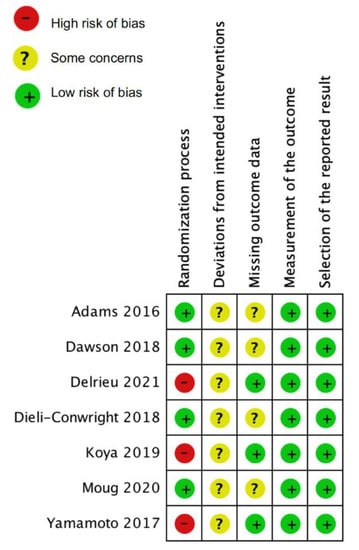 The overall risk of bias of included studies was of some concern, mainly due to potential bias arising from “deviations from intended intervention” and “missing outcome data.” (Figure 2) The three quasi-experimental studies were at high risk of bias due to the lack of randomization [24,27,29]. In addition, because participants in exercise trials cannot be blinded to intervention assignment, all studies included were judged as “some concerns” for “deviations from intended intervention.” The outcome availability in all the RCTs was less than 95% of the randomized participants. This was likely due to these outcomes being secondary analyses [23,25,28], except for Dieli-Conwright et al. [26]. Therefore the “missing outcome data” was classified as “some concerns” for the four RCTs. All included studies were at low risk of potential bias in measurement of the outcome and result reporting.