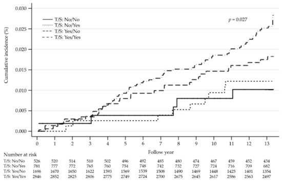 We followed up 5879 women aged ≥30 years for 72,453 person-years. The incidence of female BC was 154.6 per 100,000 person-years (95% CI: 127.9–185.3). The median of the follow-up period was 13.25 years. The average age upon diagnosis of female BC was 55.82 ± 10.95 years. During the observation period, the Nelson–Aalen estimate of the cumulative incidence of female BC was 0.1% in one year, 0.3% in three years, 0.8% in five years, and 1.5% in 10 years. The cumulative incidence regarding the time spent sitting ≥3 h/day and sugary drink intake group was significantly higher than that in the time spent sitting 0–2.9 h/day and no sugary drink intake group (log-rank test p = 0.027; Figure 2).