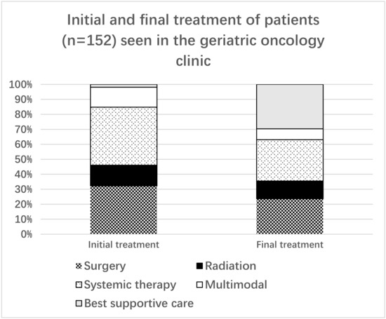 Treatment plans were modified in 78 patients (51%) and remained unchanged in 74 (49%). Over 96% of the modified treatment plans resulted in a reduction in treatment intensity (42%) or best supportive care only (54%). The breakdown of initial and final treatment is shown in Figure 2.