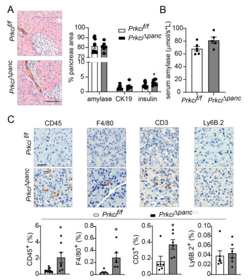 Ablation of pancreatic Prkci expression increases pancreas immune cell infiltration. (A) Representative image of IHC detection of acinar (amylase; pink) and ductal (cytokeratin-19, CK-19; brown) cell markers in the pancreata of 1.5 month old mice (scale bar = 100 µm; left panel). Quantitation of area of IHC detection of amylase, CK19, and insulin is plotted as mean SE; n ≥ 6 (right panel). (B) Basal serum amylase level in 3.5 month old mice (n = 6, 5, respectively) is plotted as mean SE. (C) Representative images of IHC detection of infiltrating leukocytes (CD45+), macrophages (F4/80+), T-cells (CD3+), and neutrophils (Ly6.B+) in pancreata of 1.5 month old mice (scale bar = 50 µm). Quantitative analysis of IHC staining is plotted below images as mean SE; n ≥ 6. * p < 0.05 compared to Prkcif/f.