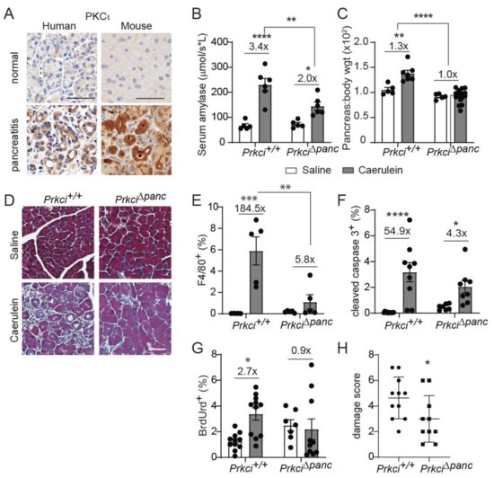 Ablation of pancreatic Prkci expression protects against caerulein-mediated damage. (A) Representative images of IHC detection of PKCι expression in normal human and mouse pancreas, human pancreatitis, and caerulein-induced severe acute mouse pancreatitis (scale bar = 50 µm). See additional images of pancreatitis tissues in Figure S4. Patient pancreatitis tissue, representative of n = 4. (B) Serum amylase in mice with caerulein-induced acute pancreatitis. (C) Pancreas/body weight ratio in 1.5 month old mice with caerulein-induced acute pancreatitis. (D) Representative images of Masson’s trichrome stain in mouse pancreas after caerulein-induced severe acute pancreatitis (scale bar = 50 µm). Quantitation of IHC detection of (E) macrophages (F4/80+), (F) apoptosis (cleaved caspase 3), and (G) proliferation (BrdUrd incorporation) in pancreata of mice with caerulein-induced severe acute pancreatitis. (H) Pancreatitis damage score plotted for mice with caerulein-induced severe acute pancreatitis. (B,C,E–H) Mean SE is plotted; n ≥ 5 for acute and n ≥ 7 for severe acute pancreatitis analyses; * p < 0.05, ** p < 0.01, *** p < 0.001, **** p < 0.0001. The number above bar indicates fold-change induced by caerulein treatment.